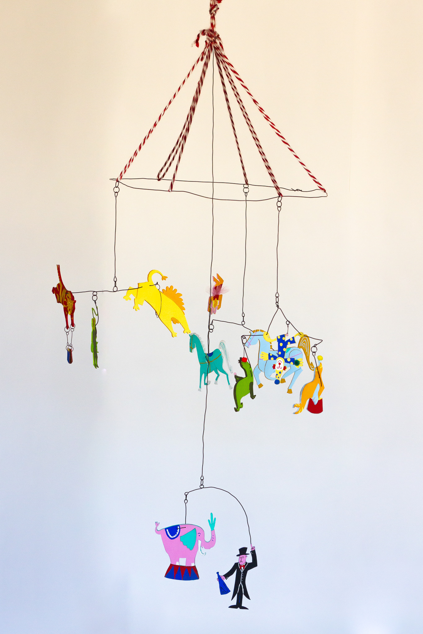 The characters were hand drawn, then scanned into a computer to create vector images, then cut in layers onto chipboard using a Glowforge laser cutter. Each layer was then glued together, hand painted, and connected into the mobile with wire and string.